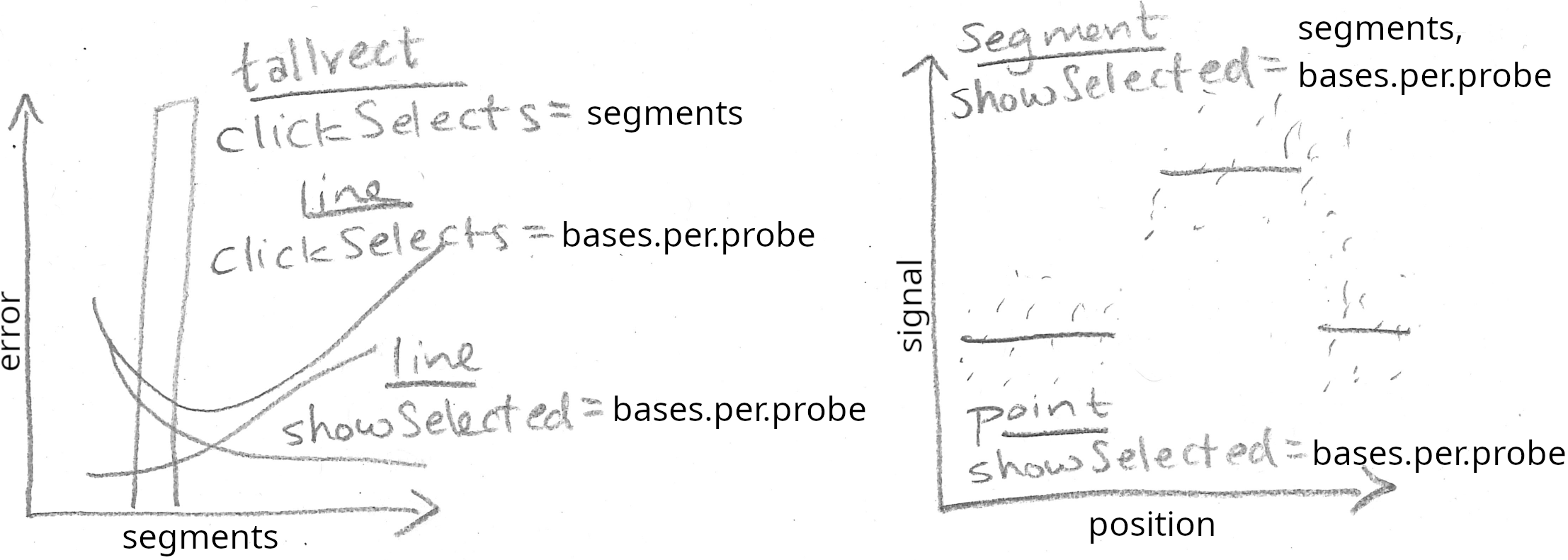Le graphique ci-dessus comprend un geom_tallrect avec clickSelects=segments et un geom_line avec clickSelects=bases.per.probe. Il sera utilisé pour sélectionner les données et le modèle dans le graphique ci-dessous.