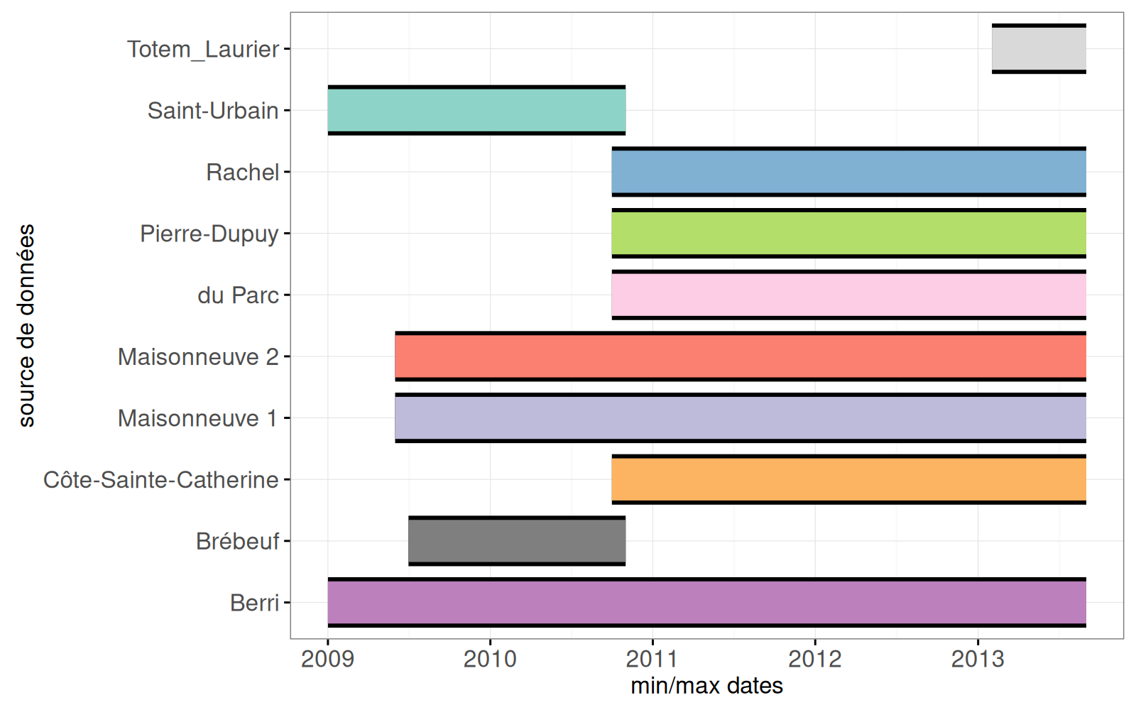 - En bas à gauche : le min et max dates pour chaque source de données.