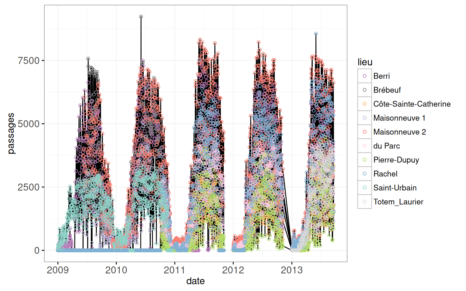 (passages_dt <- data.table(montreal.bikes$counter.counts)[, .(