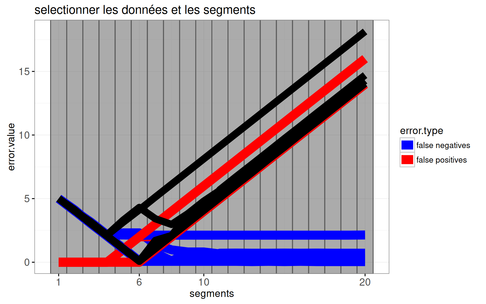 Le graphique ci-dessus comprend un geom_tallrect avec clickSelects=segments et un geom_line avec clickSelects=bases.per.probe. Il sera utilisé pour sélectionner les données et le modèle dans le graphique ci-dessous.