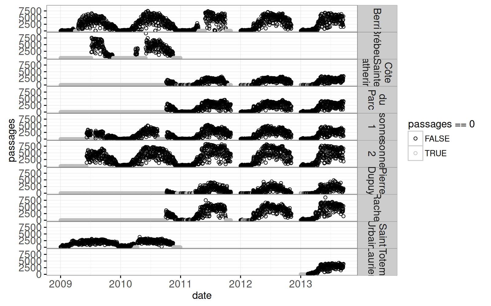 data=COMPTEURS(passages_dt)))Warning: Removed 407 rows containing missing values (geom_point).