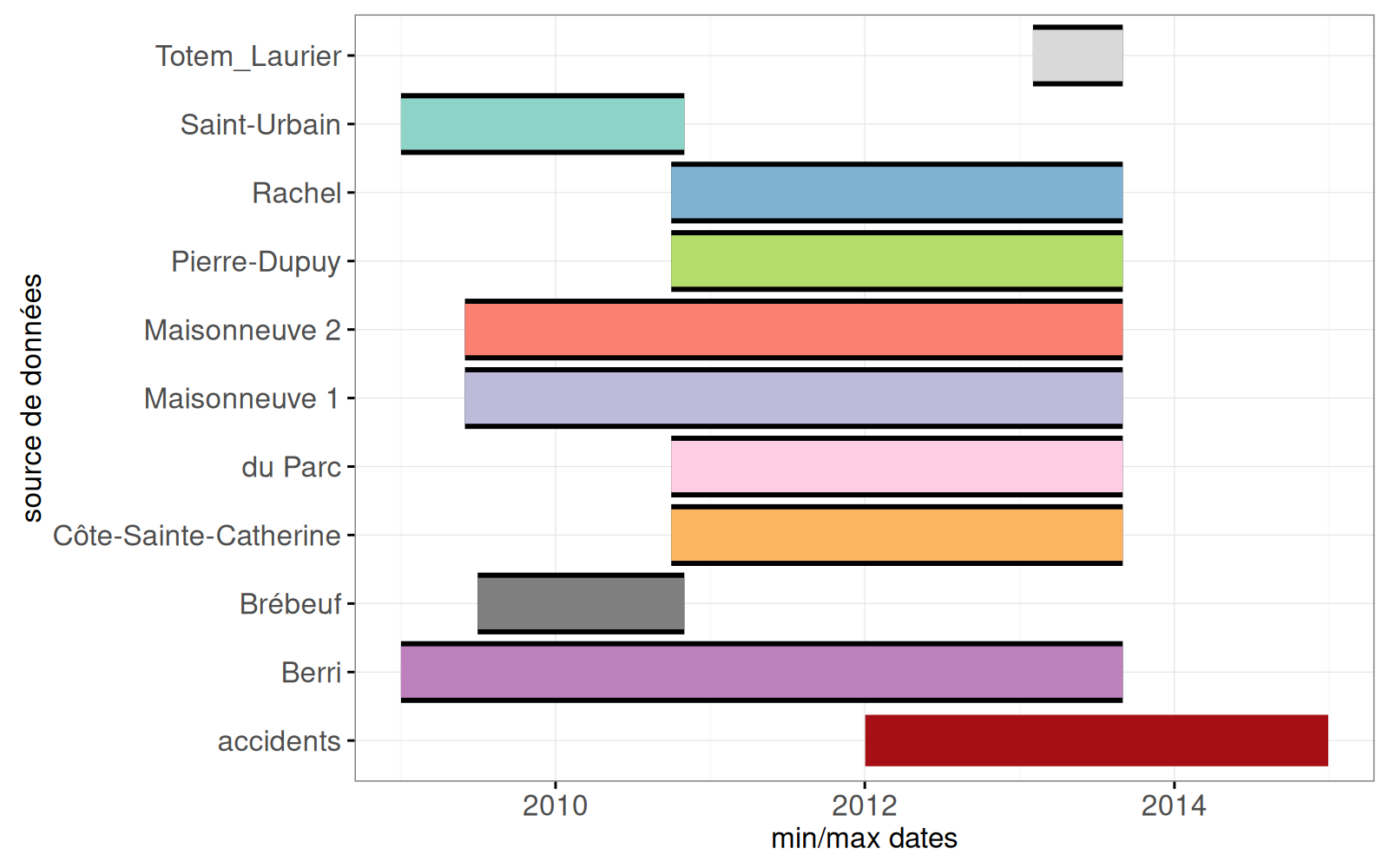 - En bas à gauche : le min et max dates pour chaque source de données.