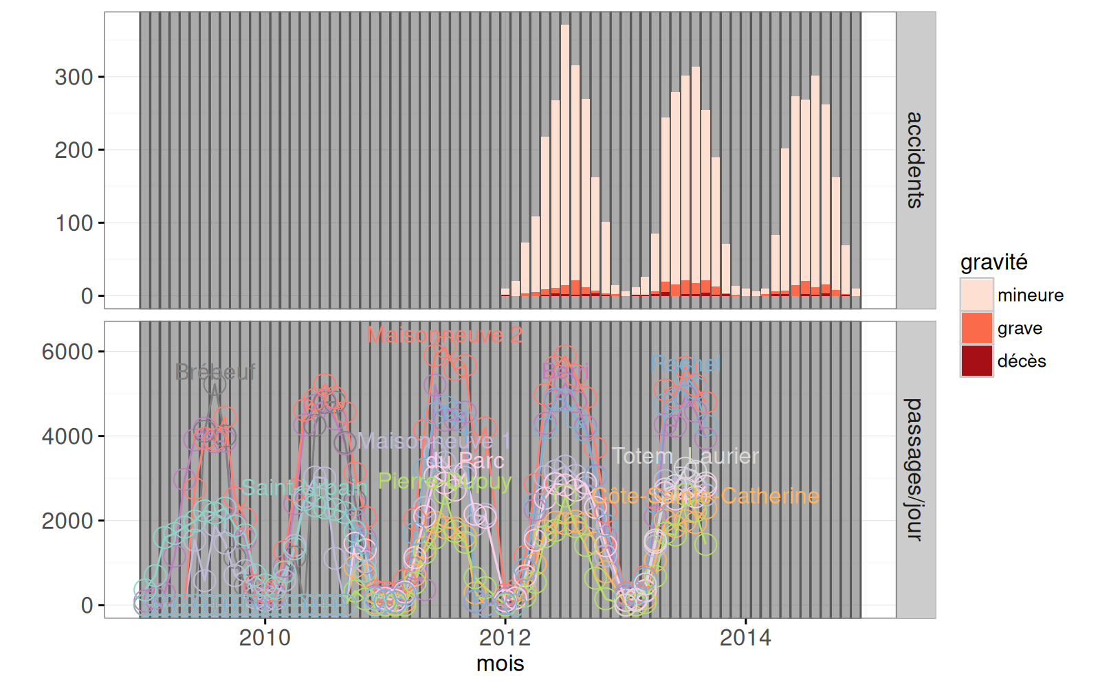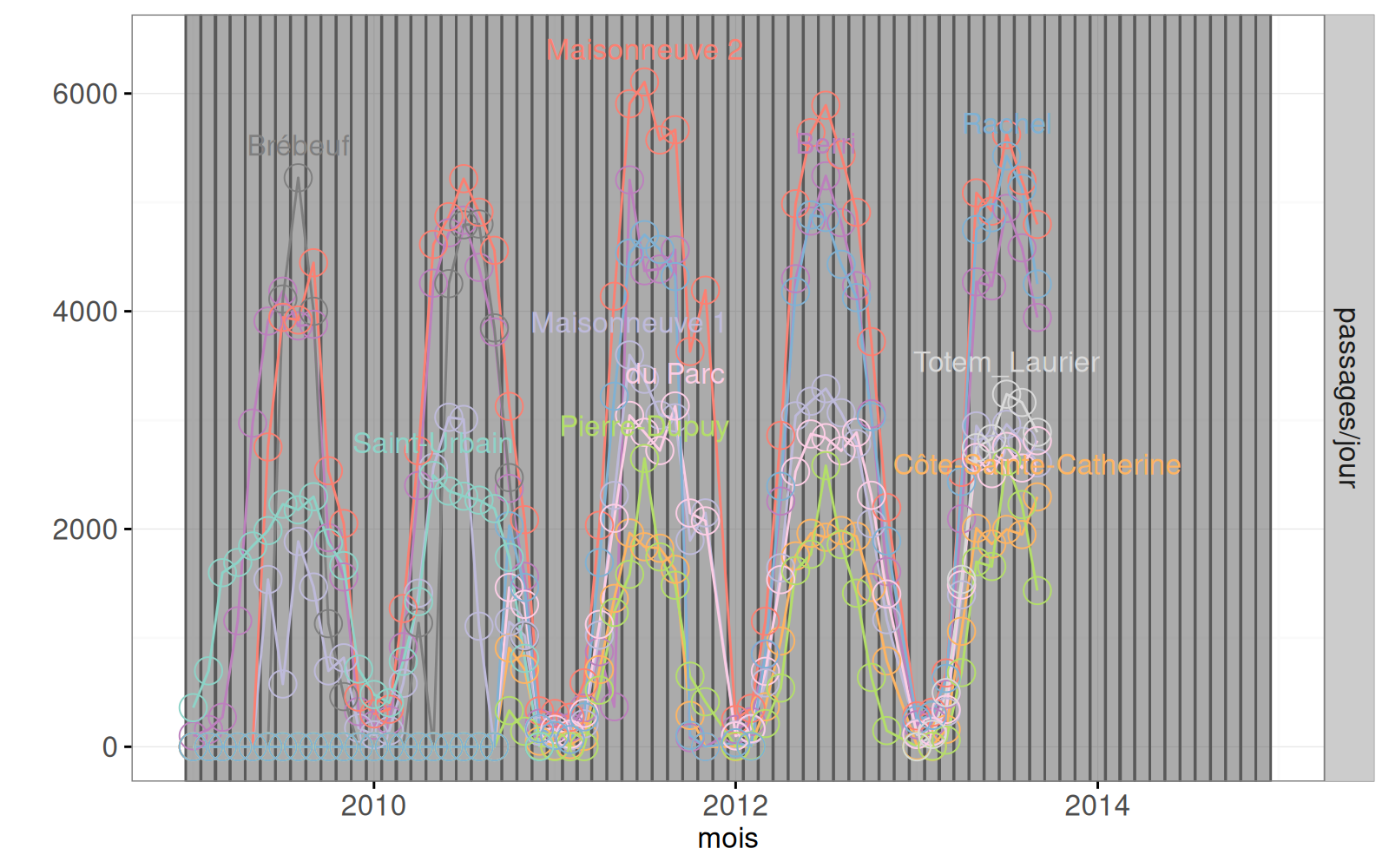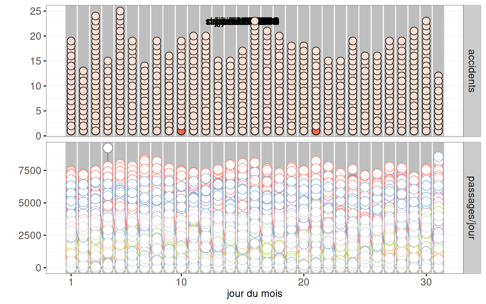 aes(color=lieu)pour chaque compteur, dont la taille varie en fonction des passages dans le mois sélectionné. - Sur le graphique