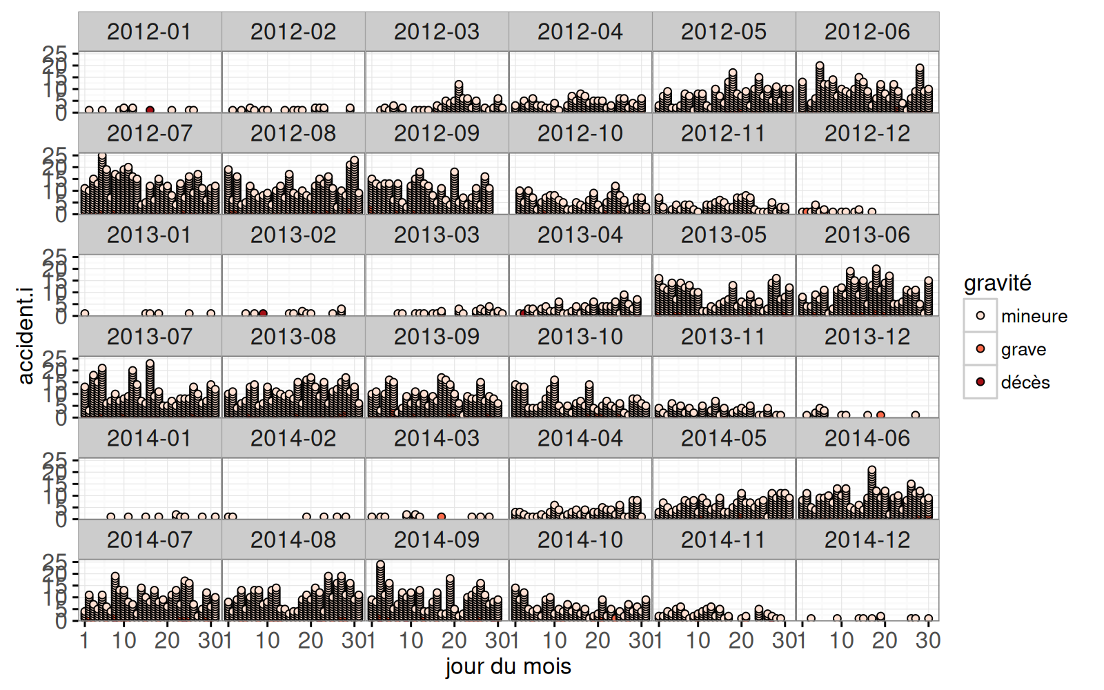 Dans la sortie ci-dessus, on voit un point pour chaque accident. Ensuite, on fait une grille de jours dans le code ci-dessous.