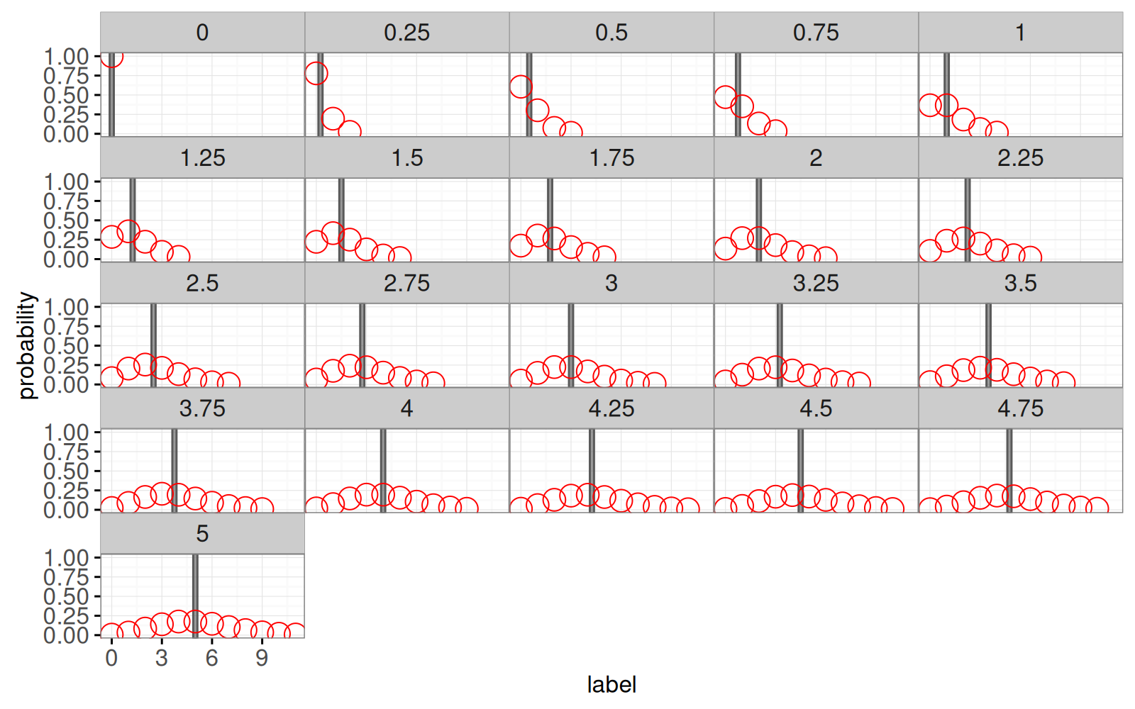 Note that for integer values of the Poisson mean, there are two labels that are the most probable (the mode of the Poisson distribution).